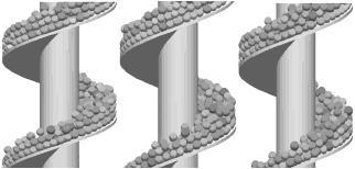 螺旋垂直提升機(jī)是螺旋輸送機(jī)中常見的一種。傳統(tǒng)的設(shè)計(jì)方法主要依靠經(jīng)驗(yàn)公式設(shè)計(jì),導(dǎo)致很難對螺旋輸送機(jī)的性能有很大程度地提升,而其在制藥、港口、農(nóng)業(yè)、水泥、食品等行業(yè)應(yīng)用廣泛,因此有必要對螺旋輸送機(jī)的設(shè)計(jì)與制造方法進(jìn)行研究。隨著計(jì)算機(jī)仿真技術(shù)的發(fā)展,越來越多的試驗(yàn)應(yīng)用于虛擬樣機(jī)的模擬中,這種處理不僅可以減少成本,提高效率,而且 能夠使設(shè)計(jì)者從產(chǎn)品的作用機(jī)理入手,解決在實(shí)際的 試驗(yàn)中很難觀察物料輸送中細(xì)觀甚至微觀特征[1-2]。螺 旋輸送機(jī)性能的模擬研究,早是由 Shimizu 等[3]發(fā)表 離散元法對螺旋輸送機(jī)中顆粒流的研究,并將研究結(jié) 果與先前的經(jīng)驗(yàn)方程進(jìn)行了對比分析。Cleary[4]研究了 顆粒形狀對喂料口進(jìn)入的物料下降形式和輸送機(jī)的輸送特性的影響。Owen 等[5] 詳細(xì)研究了操作條件,如 填充率、傾角和螺旋轉(zhuǎn)速等對螺旋輸送機(jī)性能的影 響,但其未對螺旋葉片的形狀進(jìn)行詳細(xì)討論。而這一課題在國內(nèi)尚未有詳細(xì)的研究。本文中將對螺旋葉片進(jìn)行研究,并結(jié)合其他操作條件,預(yù)測螺旋輸送機(jī)的性能。