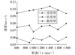 通過離散元模擬,得出了在不同轉(zhuǎn)速下的 3 種 不同螺旋葉片形狀對平均軸向速度變化趨勢,如圖 5 所示。 考察近軸處 12.75 mm 以內(nèi)圓柱的平均軸向速 度,在螺旋轉(zhuǎn)速小于 1 600 r/min 時(shí),隨著轉(zhuǎn)速的增加, 對于直線型、折線型的螺旋葉片,其平均軸向速度成 增大的趨勢,但曲線型的螺旋葉片,其平均軸向速度 沒有明顯的變化趨勢,且其軸向輸送速度遠(yuǎn)小于直 線型、折線型母線的螺旋葉片對應(yīng)的平均軸向速度; 但當(dāng)螺旋轉(zhuǎn)速大于 1 600 r/min 后時(shí),曲線型母線的 螺旋葉片對應(yīng)的平均軸向速度超過了直線型、折線型母線的螺旋葉片的平均軸向速度,且直線型母線 的螺旋葉片的平均軸向速度有所減小,因此,在考慮 較大螺旋轉(zhuǎn)速下,曲線型母線的螺旋葉片具有的輸送效果,能夠減小一定輸送量中的輸送功耗,提 高輸送效率。